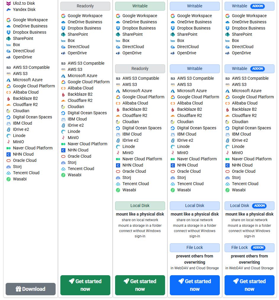 ㅡ 읽기만 가능: Box.com, MEGA, OpenDrive, AWS S3, 구글 워크스페이스, 원드라이브 비즈니스, 드롭박스 비즈니스 등등 여러 사이트. (이 사이트들 중 상당수는 상위 유료구독플랜에서 사용가능)