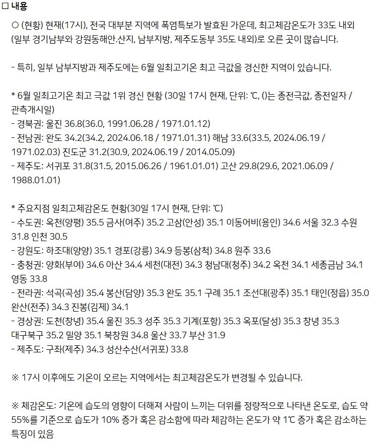 < 폭염특보 현황 및 일최고체감온도 > □ 내용 ○ (현황) 현재(17시), 전국 대부분 지역에 폭염특보가 발효된 가운데, 최고체감온도가 33도 내외(일부 경기남부와 강원동해안.산지, 남부지방, 제주