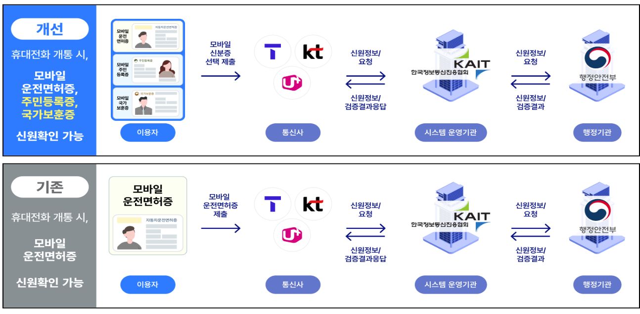 그동안은 모바일 신분증으로 개통(신규가입, 번호이동, 명의변경 등)하려면, 모바일 운전면허증만 사용할 수 있었으나, 이번 조치를 통해 모바일 주민등록증과 모바일 국가보훈등록증도 사용할 수 있게 되었다.