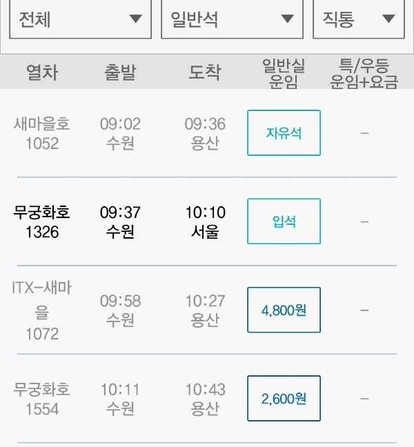 ㅡ 코레일앱을 열어서 수시로 보는거죠. 좌석이나 입석을 살 수 있는지. 그리고 결제.