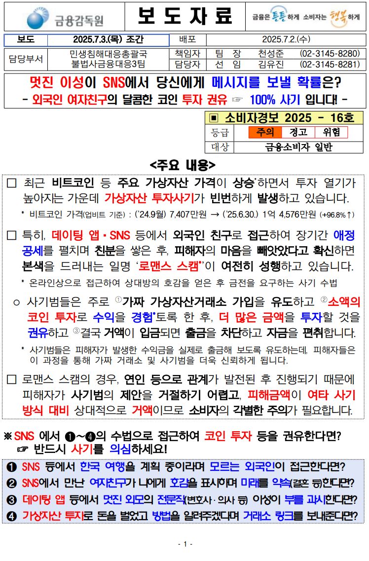 SNS서 만난 이성친구가 코인 권유?…금감원, '로맨스 스캠' 경보