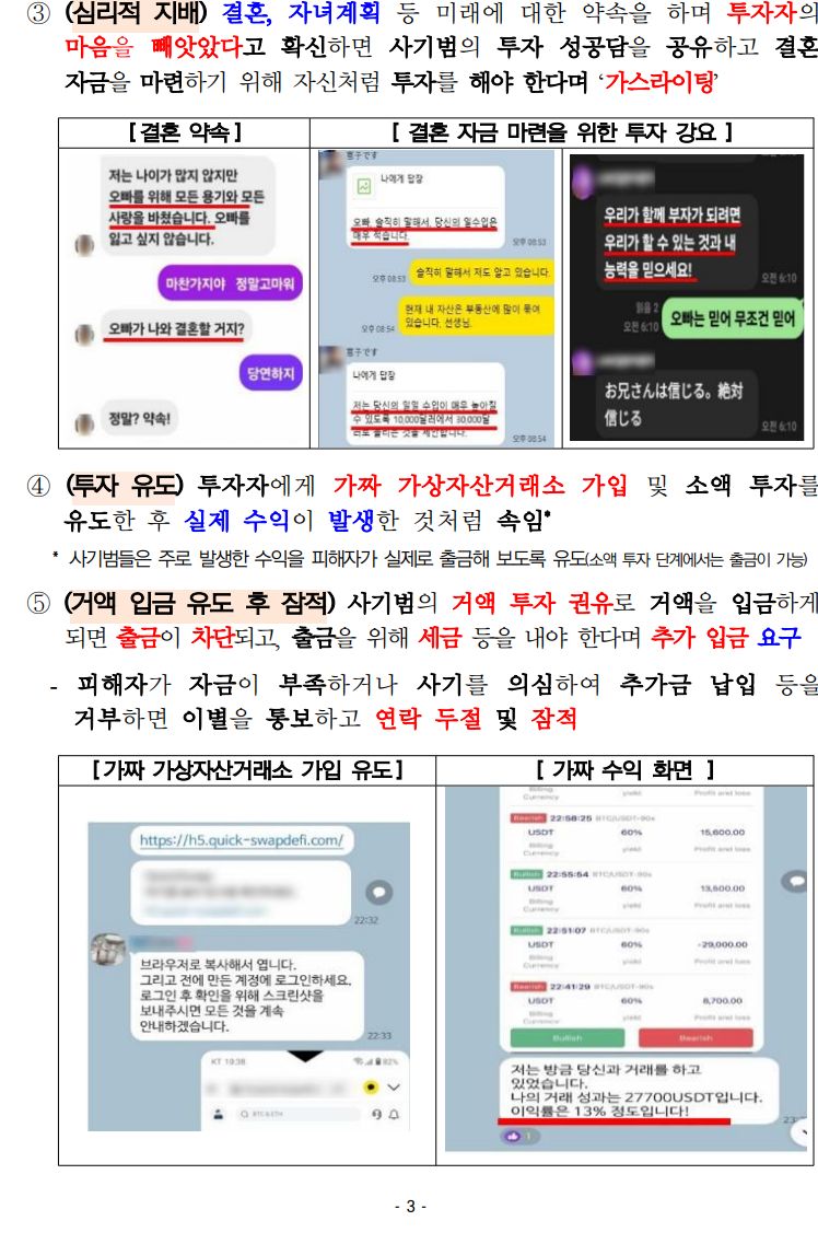 ㅇ 사기범들은 주로 ①가짜 가상자산거래소 가입을 유도하고 ②소액의 코인 투자로 수익을 경험*토록 한 후, 더 많은 금액을 투자할 것을 권유하고 ③결국 거액이 입금되면 출금을 차단하고 자금을 편취합니다.
