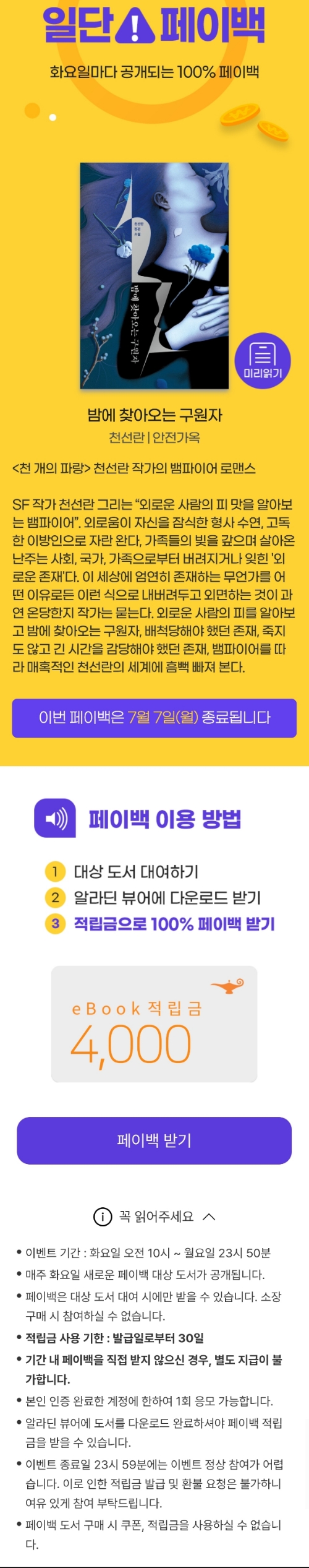 매주 화요일 100% 돌려드려요, 일단 페이백 밤에 찾아오는 구원자