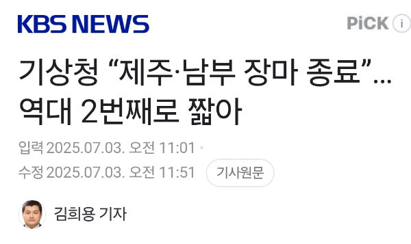 기상청 “제주·남부 장마 종료”…역대 2번째로 짧아