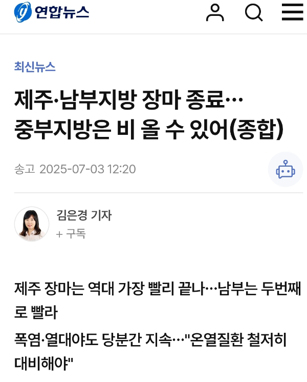 제주·남부지방 장마 종료…중부지방은 비 올 수 있어(종합) | 연합뉴스