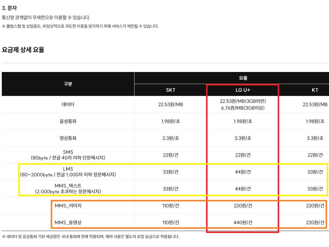 예를 들어 이 통신사의 어떤 초가성비 요금제는, 문자는 월 50건이나 150건이 기본제공이지만, SMS만 무료제공건수에 포함이고 LMS, MMS는 종량제 처리하기도 합니다.3 )