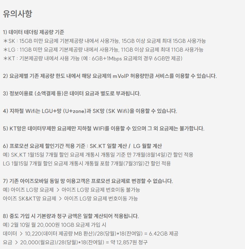 (아이즈모바일에서 요금제 설명을 볼 때는, 가장 상단에 나오는 이 화면이 가장 중요하고, 그 밑 설명에 적인 말과 상충되는 내용이 있다면 이것이 맞는 모양이다.2)