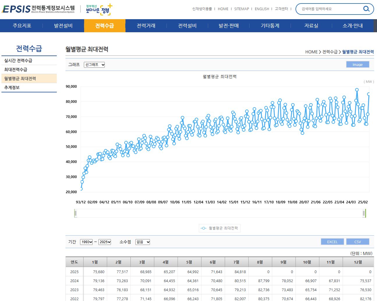 1993년 이래 월별 평균 최대 전력전력