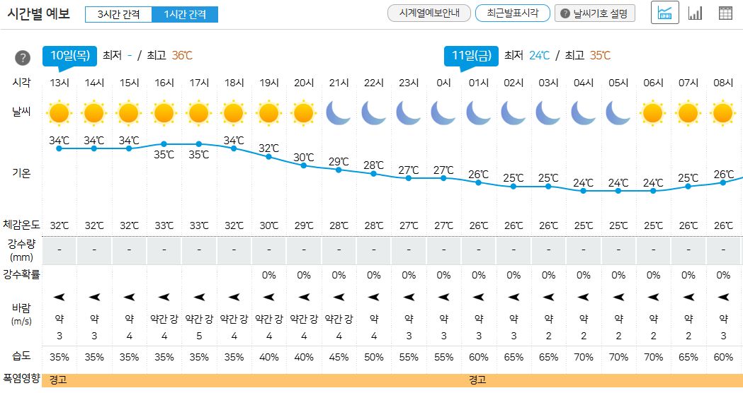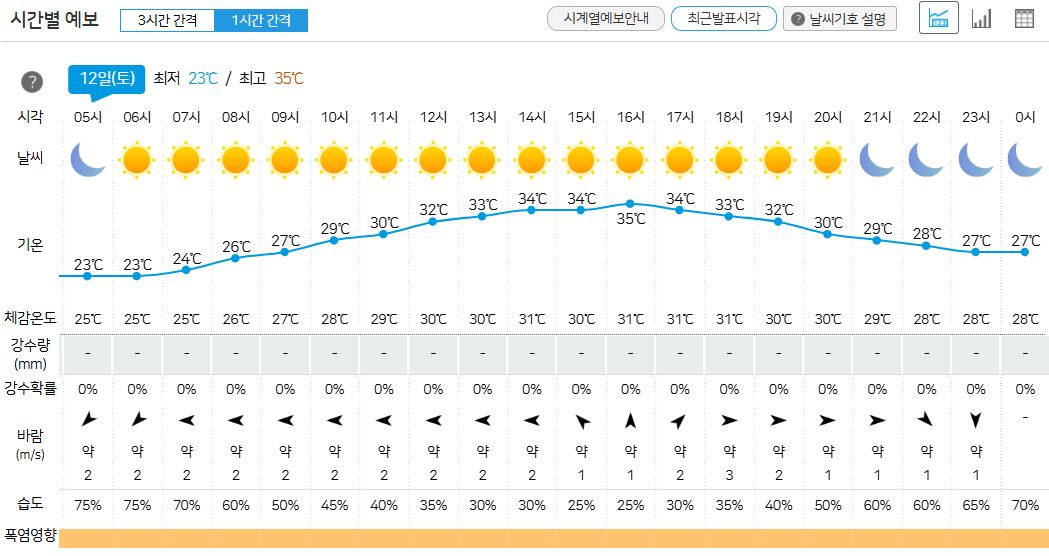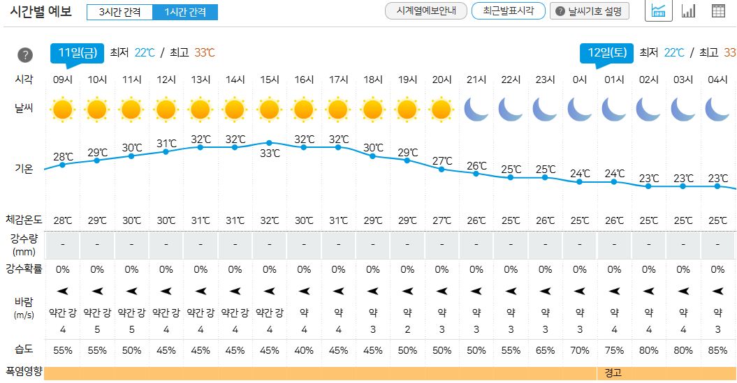 여기도 마찬가지로 낮최고 온도는 32~33도, 낮최저 습도는 35~40%