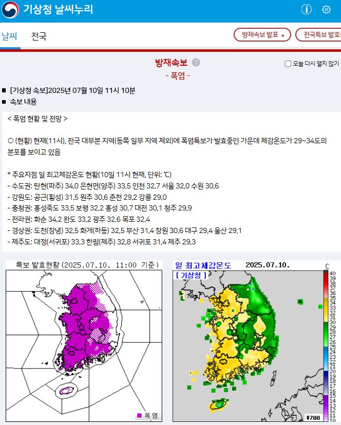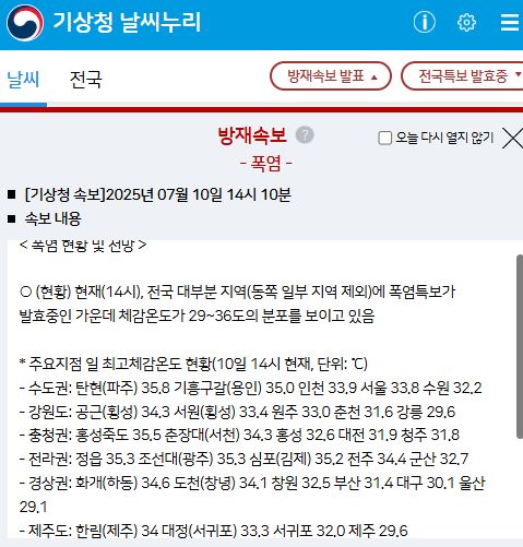 서울지역, 기상청 날씨누리 2025.7.10. 기준