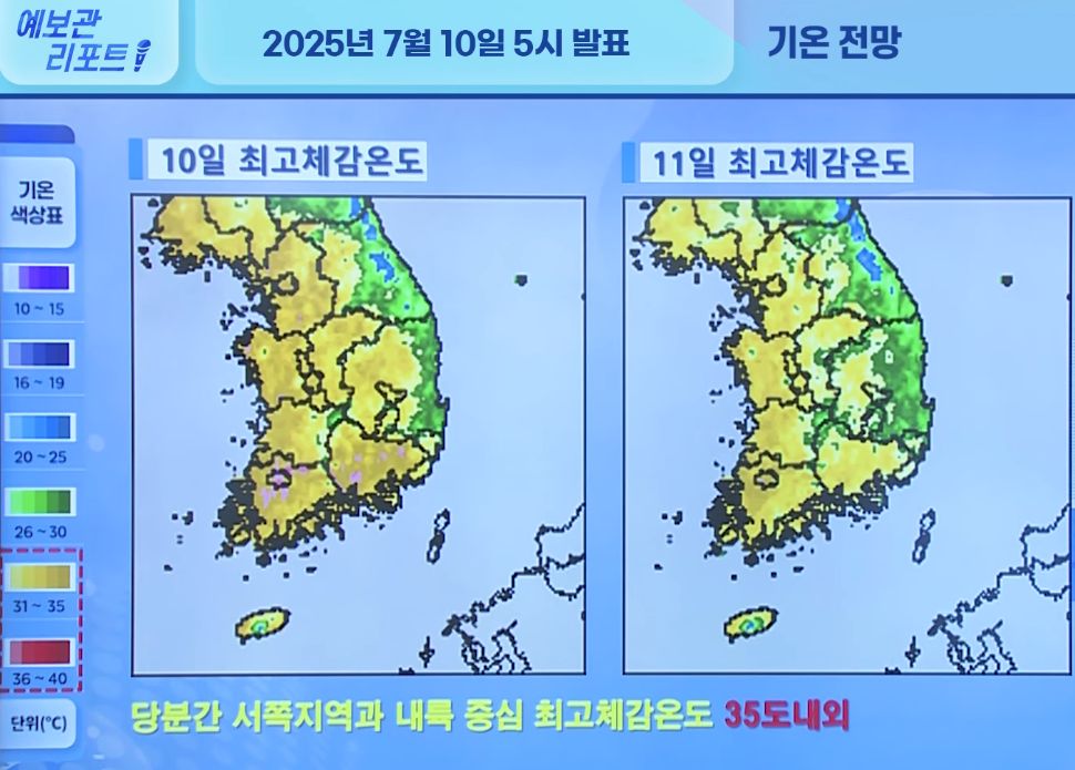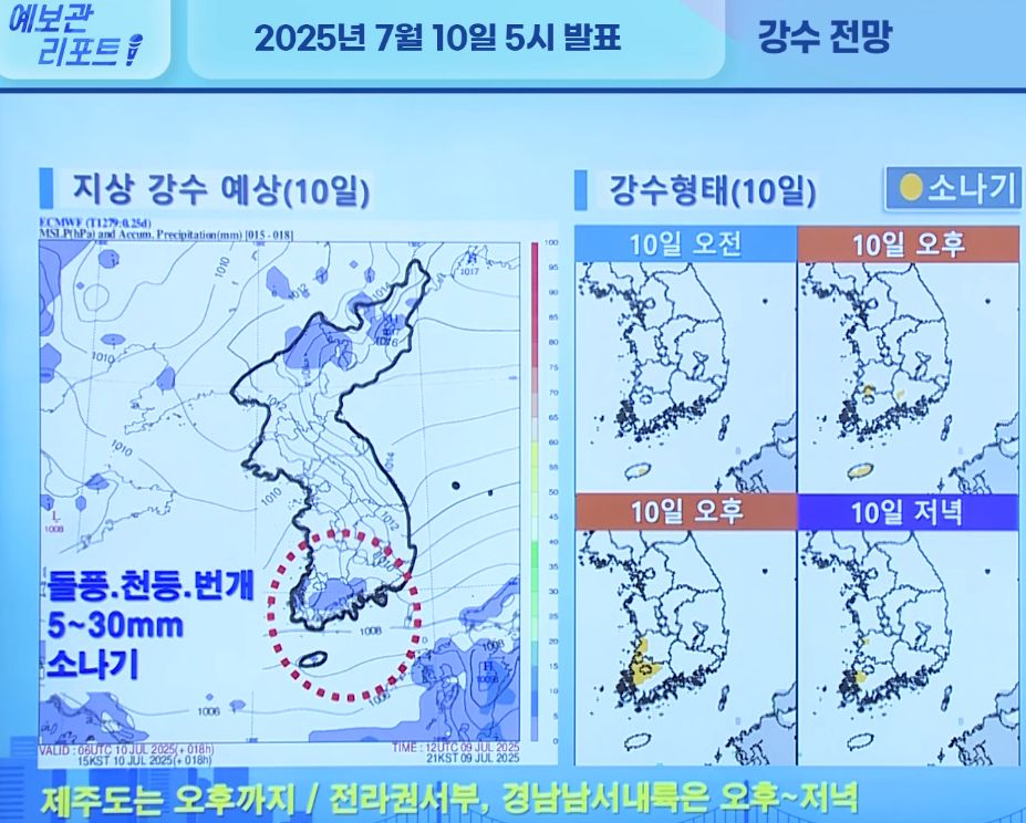 전국 대부분 폭염 지속, 전라권서부/제주도 중심 소나기 (기상청 예보 25년 7월 10일 5시 기준)