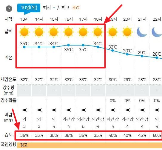 낮 기온 34~35도, 낮 최저 습도 35%