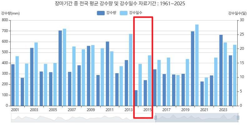 당해년인 2014년에는 그해 연간 강수량은 평년보다 좀 적은 수준이었고 물부족도 상대적으로 가벼웠지만, 장맛비는 가장 적었습니다. 그때 땅은 이미 좀 마르고 있었겠죠. 그리고 이듬해인 2015년에는 장맛비는 전년도보다 많았지만, 연간 강수량이 적어서 한반도 전체에 심한 가뭄이 있었다고 합니다. 1