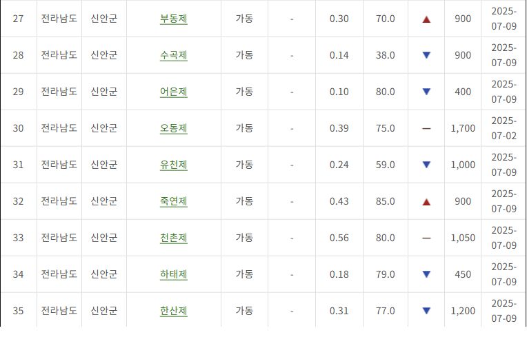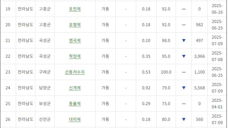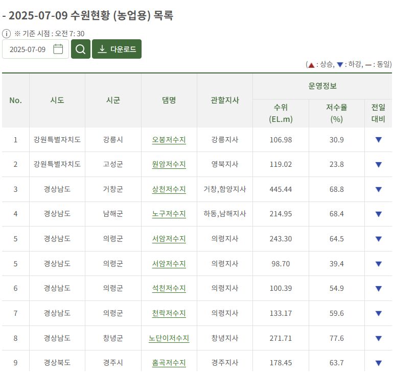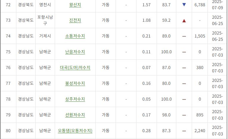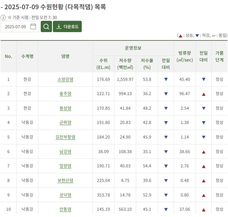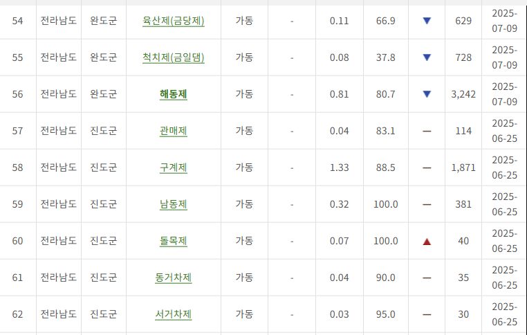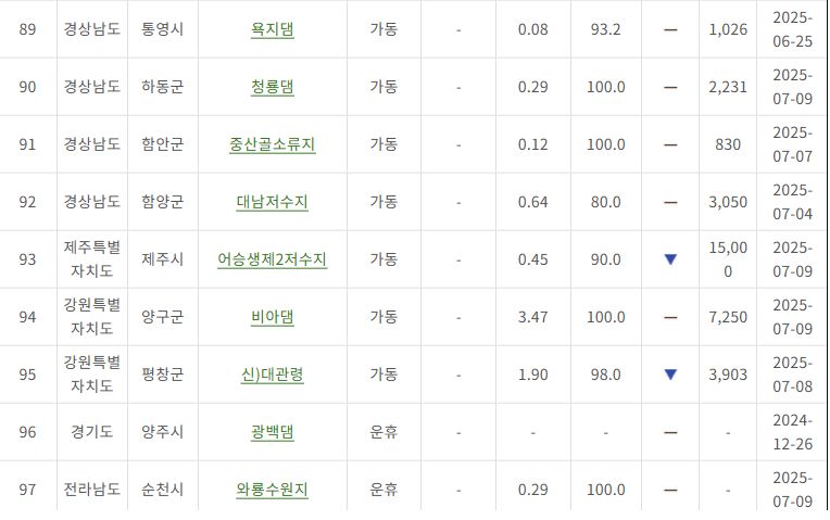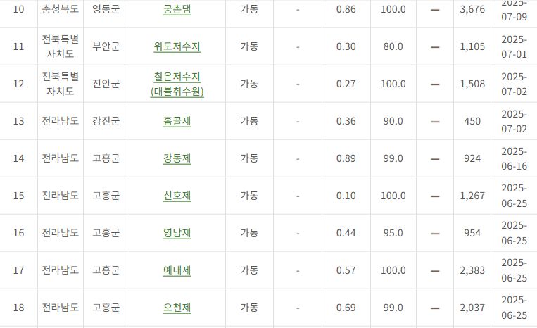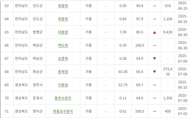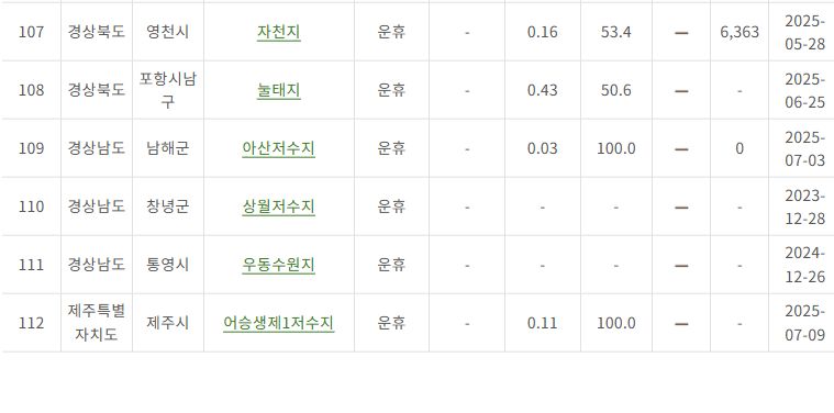 2025.7.9.일 기준 저수율 30~40%대인 댐들이 많습니다.