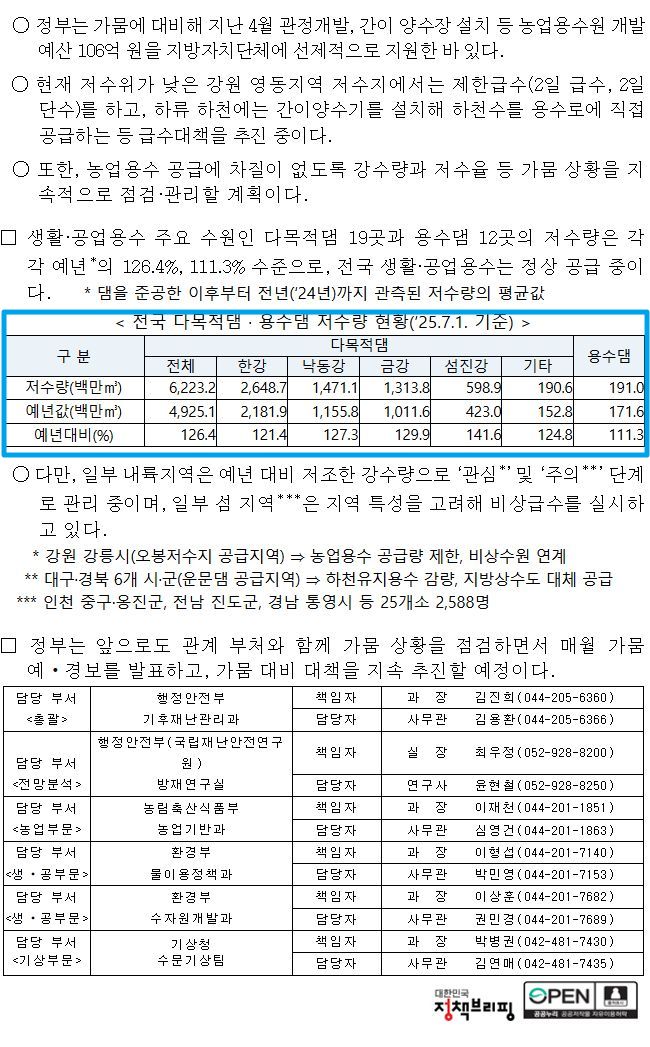 ㅡ 행정안전부, 7월 가뭄 예, 경보 보도자료 배포