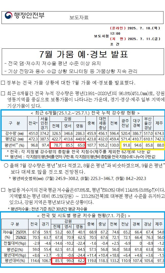 ㅡ "행안부에 따르면 최근 6개월 누적 강수량은 451.0㎜로, 평년(1991∼2020년)의 96.8% 수준이었다. 이에 따라 강원 영동지역에서는 보통가뭄이, 경기·경상·제주 일부 지역에서는 건조한 상황이 일정 지속하는 기상가뭄이 나타났다. 올해 7월 강수량은 평년보다 적겠고 (......) 농업용 저수지의 전국 평균 저수율은 67.6%로, 평년(59.0%) 대비 114.6% 수준이었다. 지역별로는 평년 대비 85.1%(강원)∼133.2%(전북)로 대부분 평년 수준을 유지하고 있으나 강원 지역은 평년보다 낮은 상황이다"
