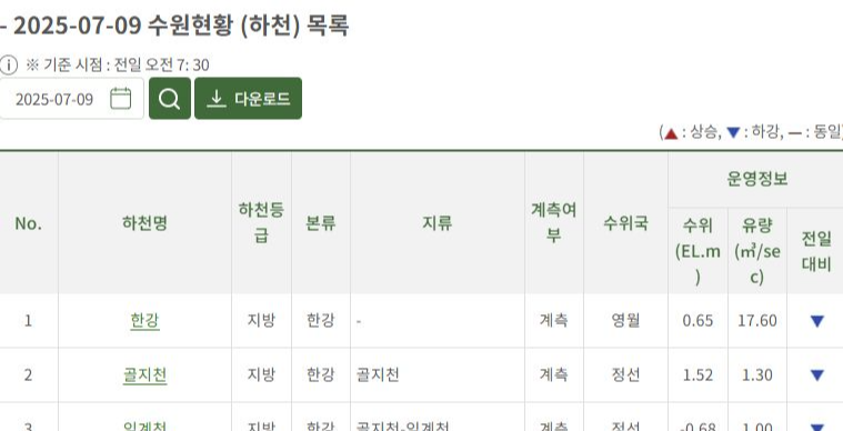 이 집계에서 한강 수위가 0.65m 라고 나온 건 무슨 뜻일까요? 또 주루룩 내려보면 북한강은 그냥 0.00, 0.00 이고 소양강은 0.19, 1.00입니다. 측정 기준을 알고 싶어졌습니다. 낙동강은 미계측,