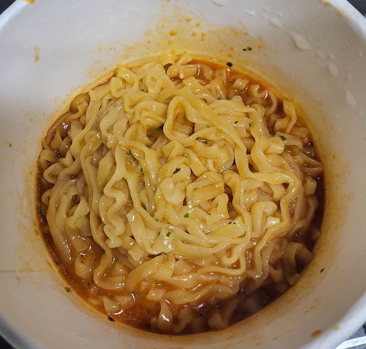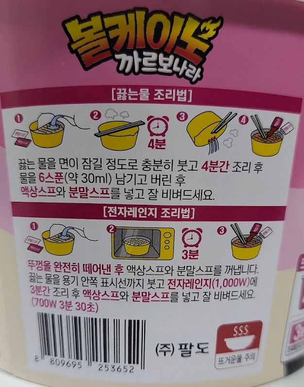 끓는물을 그릇 내부 선(면높이보다 낮다)까지 붓고 전자레인지에 3분. 그리고 물을 따라내지 말고 스프를 다 넣어 비비면 된다.