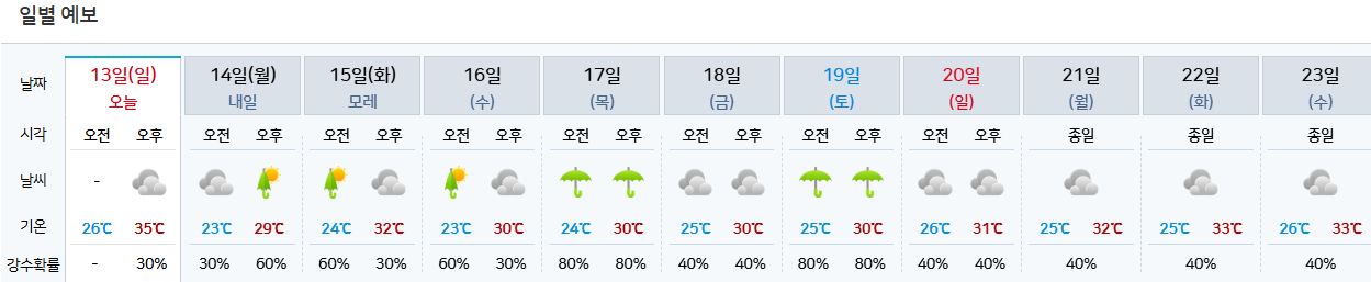 2025.7.13.일. ~7.23.수. 날씨: 이번 화요일까지 전국 돌아가며 비/:/ 기상청 13일 일요일 브리핑 /:/ 주중 비+흐림 + 내주 본문