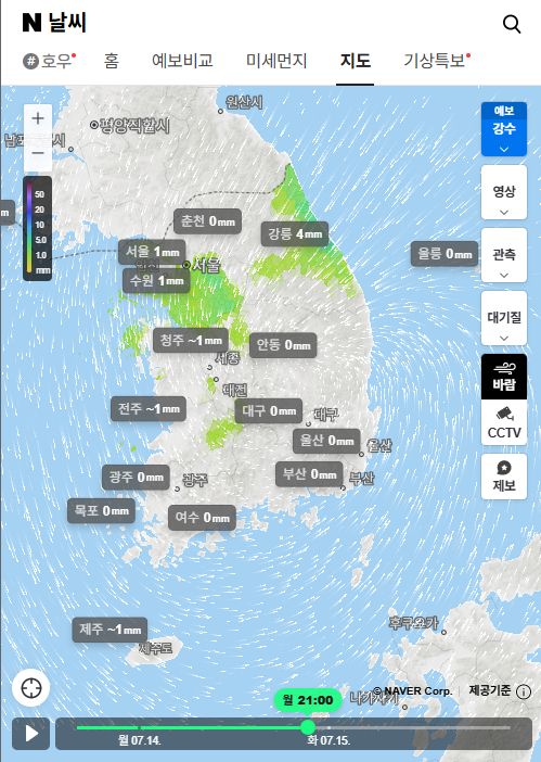 비오는 모양새가 우리 땅을 뱅글 도는 느낌이죠?
