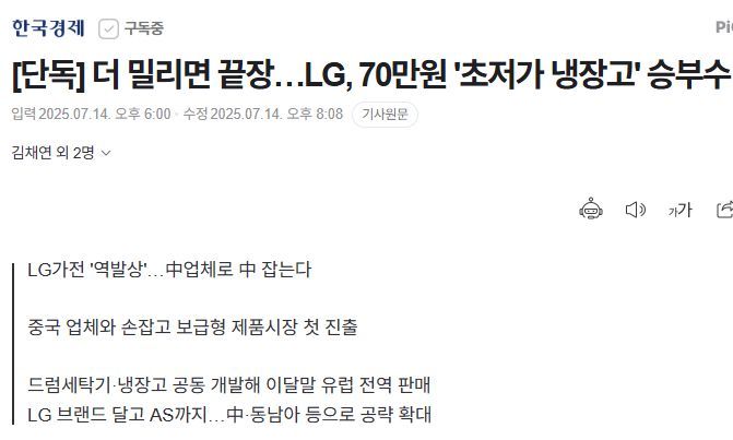 [단독] 더 밀리면 끝장…LG, 70만원 '초저가 냉장고' 승부수