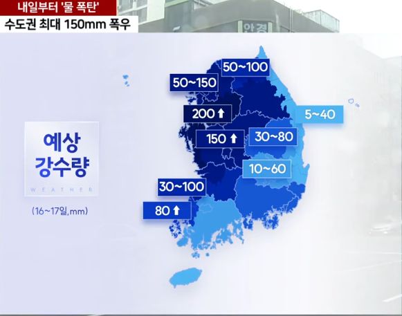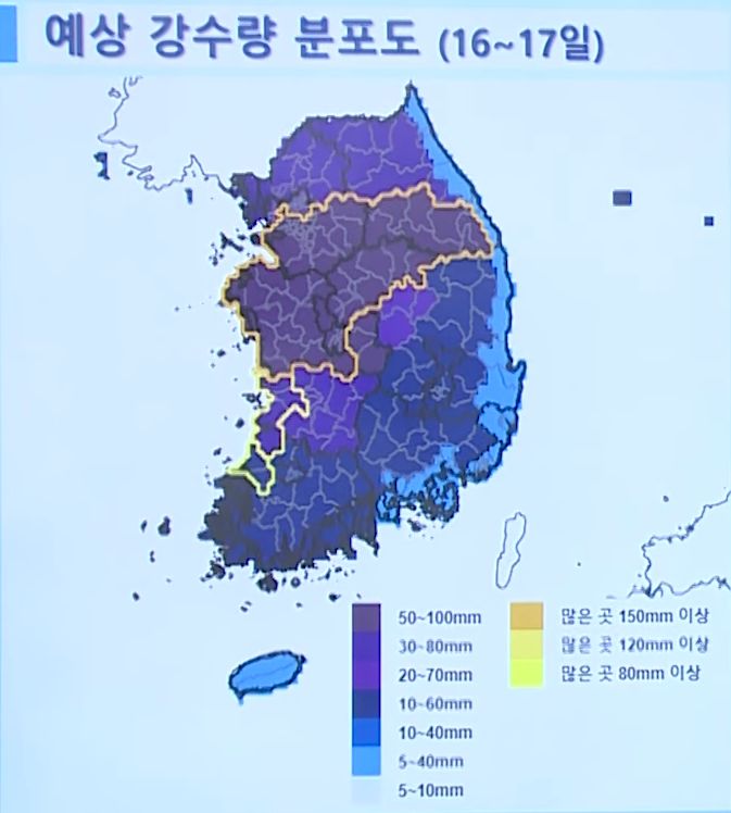 서울을 포함한 수도권에도 최대 150mm, 전남과 영남에도 많게는 80mm의 많은 비가 예상되는데요.