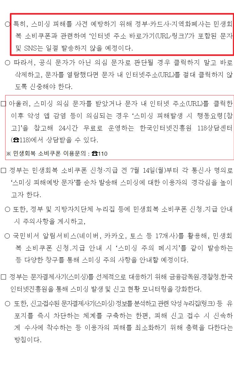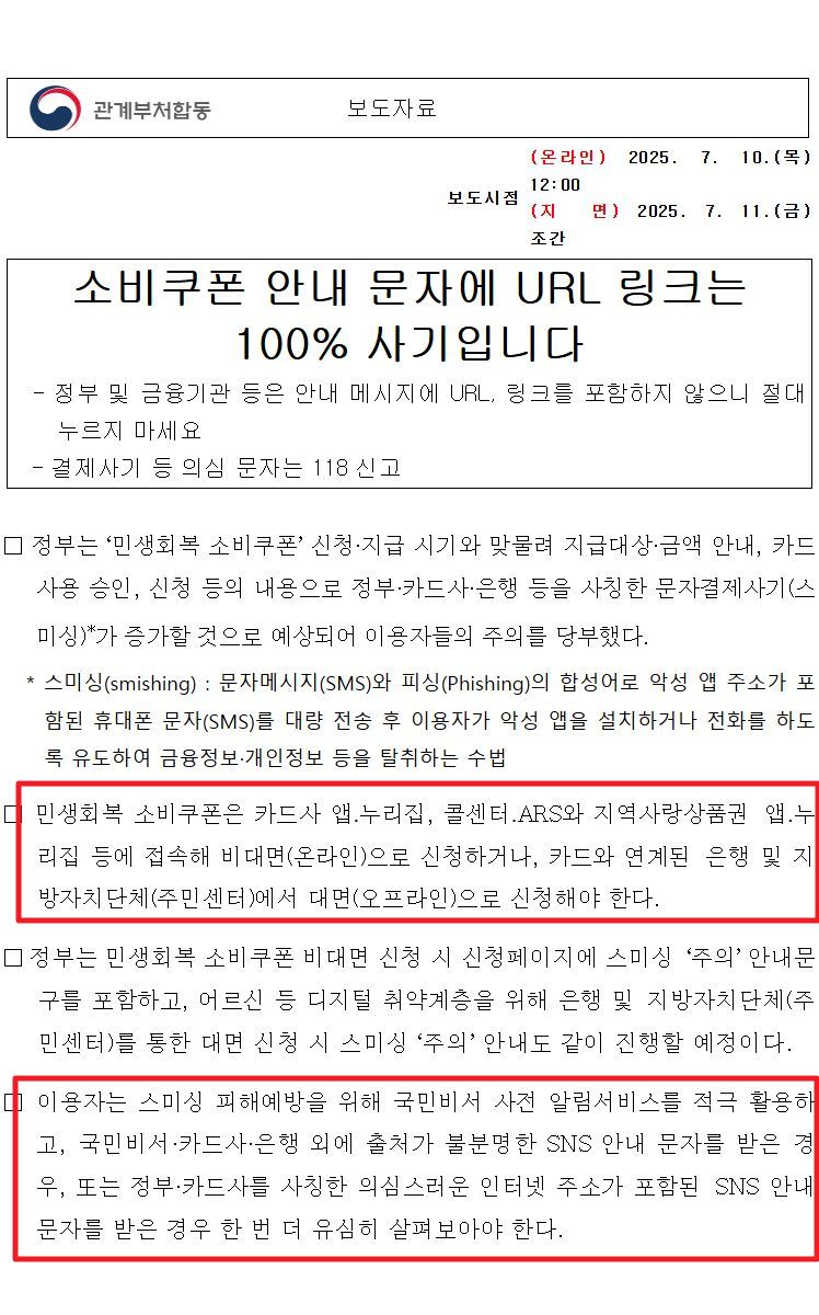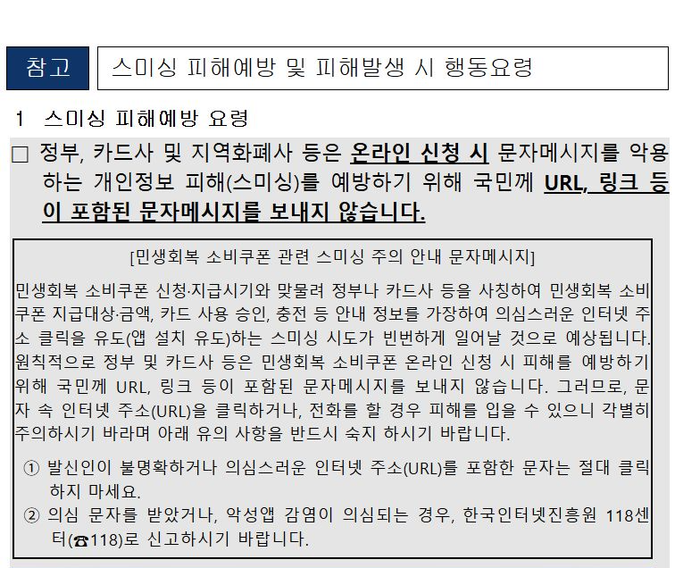소비쿠폰 안내 문자에 URL 링크는 100% 사기입니다 | 행정안전부> 뉴스·소식> 보도자료> 보도자료