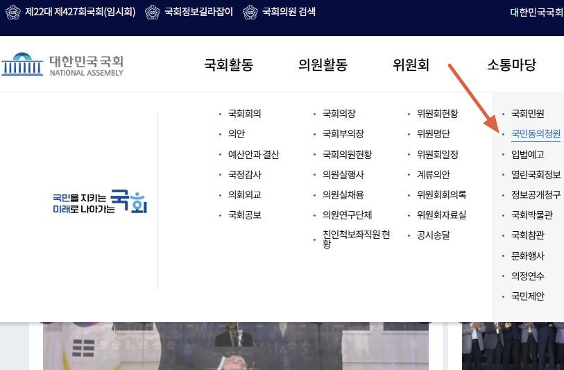 국회 홈페이지> 소통마당 > 국민동의 청원