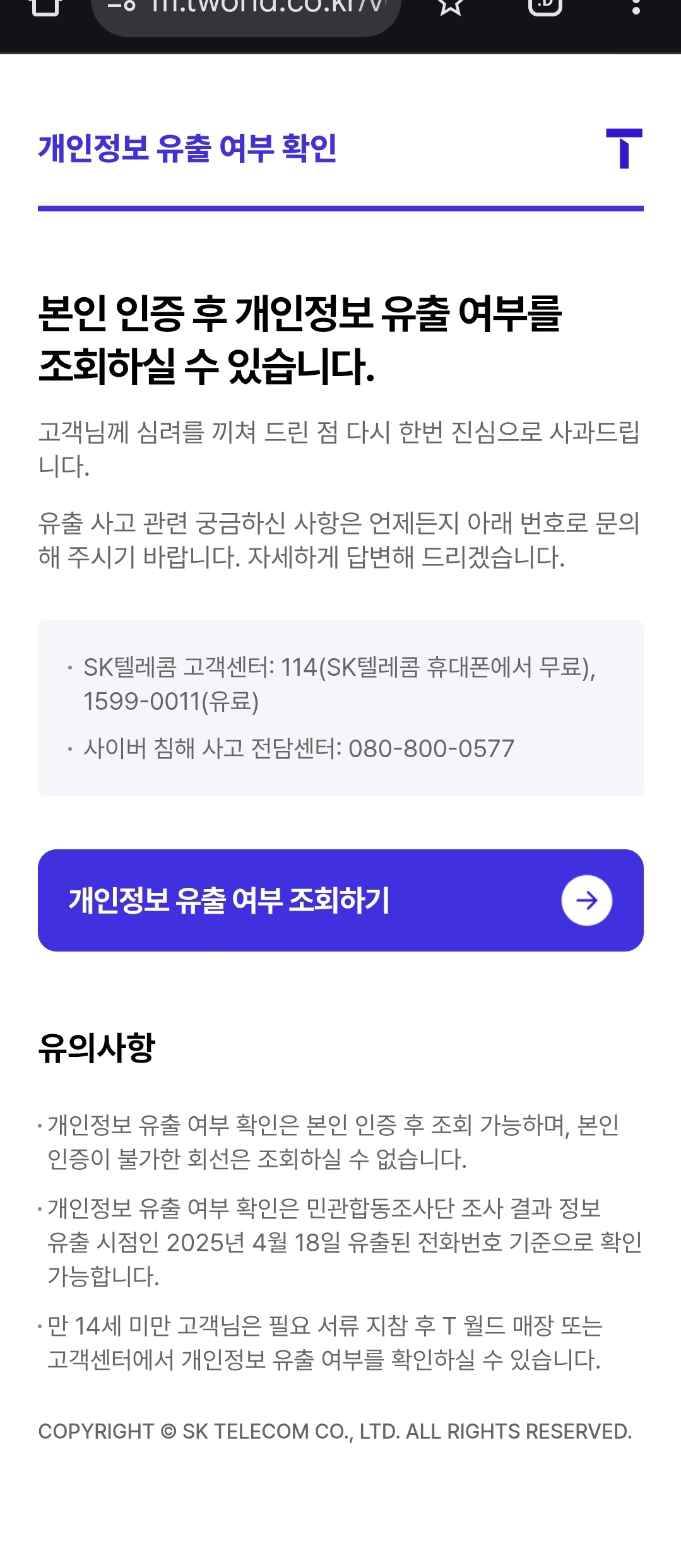 사이버 침해 사고 개인정보 유출 여부 확인 | T world