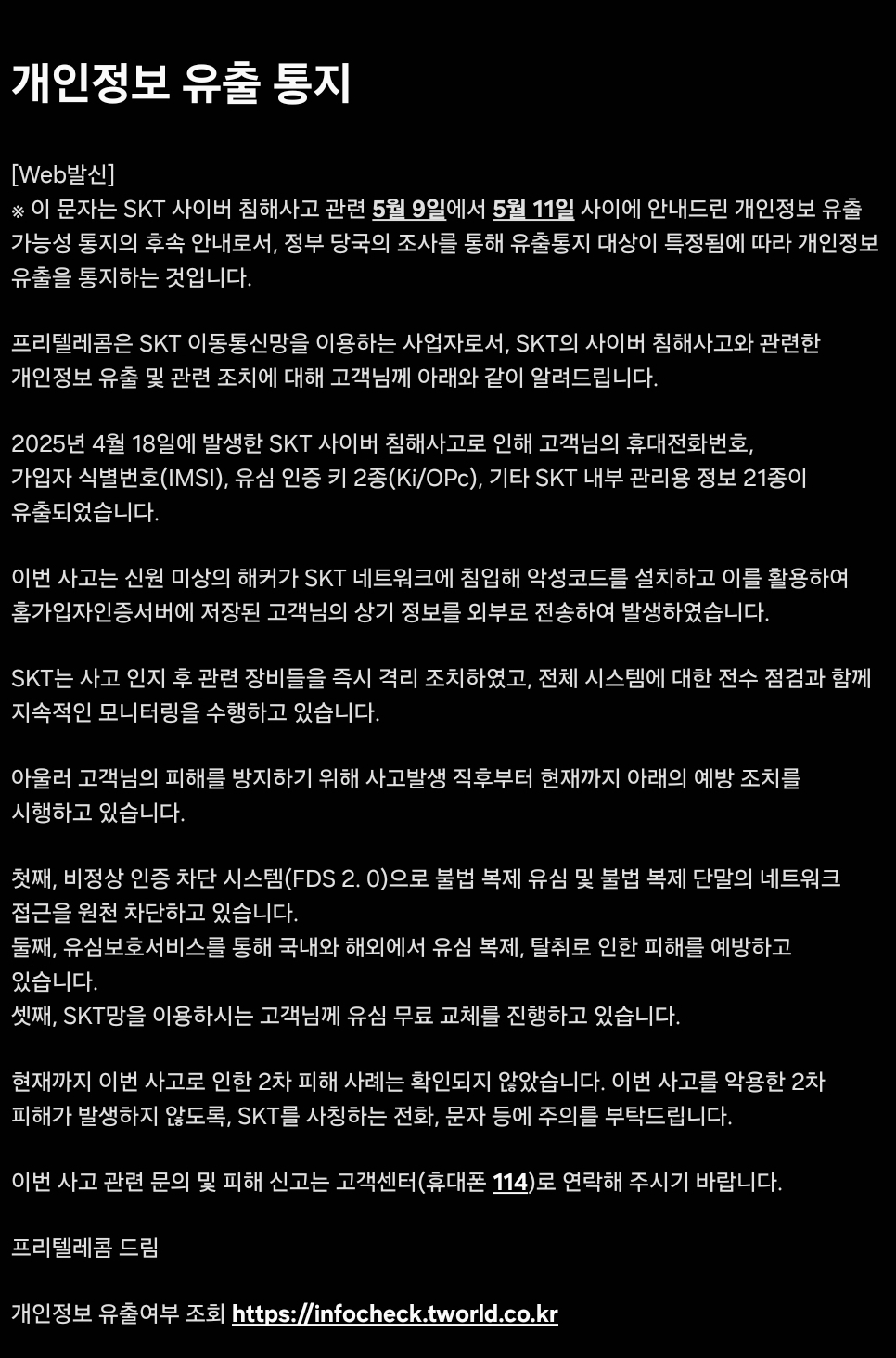 2025년 4월 18일에 발생한 SKT 사이버 침해사고로 인해 고객님의 휴대전화번호, 가입자 식별번호(IMSI), 유심 인증 키 2종(Ki/OPc), 기타 SKT 내부 관리용 정보 21종이 유출되었습니다.