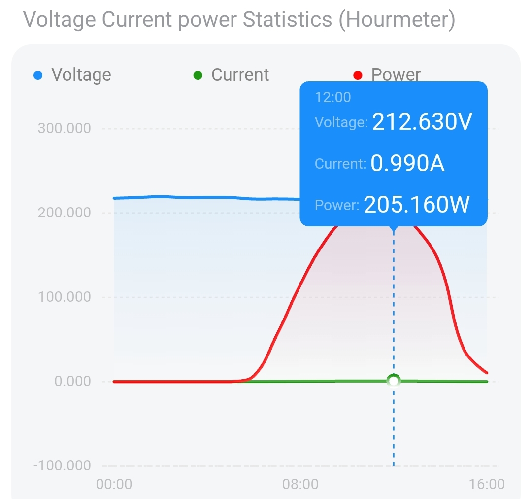 400W 패널이지만 정오쯤의 출력이 200W정도 됩니다. 반 정도인데 그래도 아주 잘 나온 것.