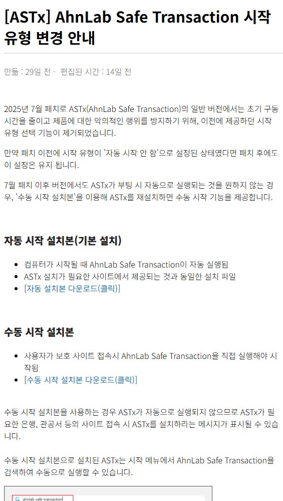 2025년 7월 패치로 ASTx(AhnLab Safe Transaction)의 일반 버전에서는 초기 구동 시간을 줄이고 제품에 대한 악의적인 행위를 방지하기 위해, 이전에 제공하던 시작 유형 선택 기능이 제거되었습니다.