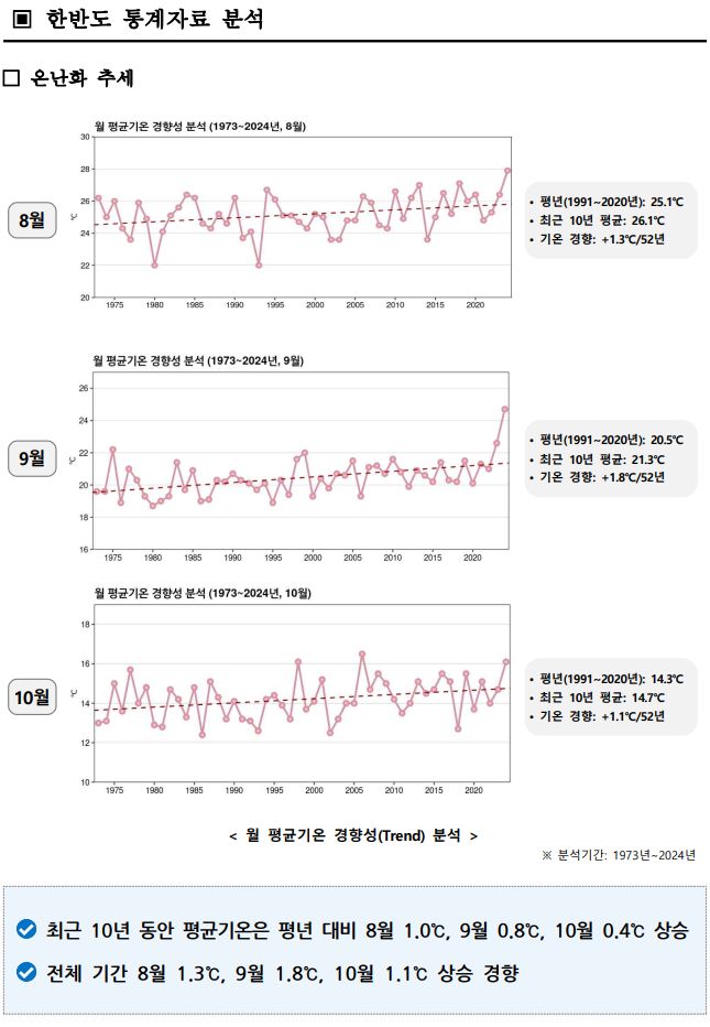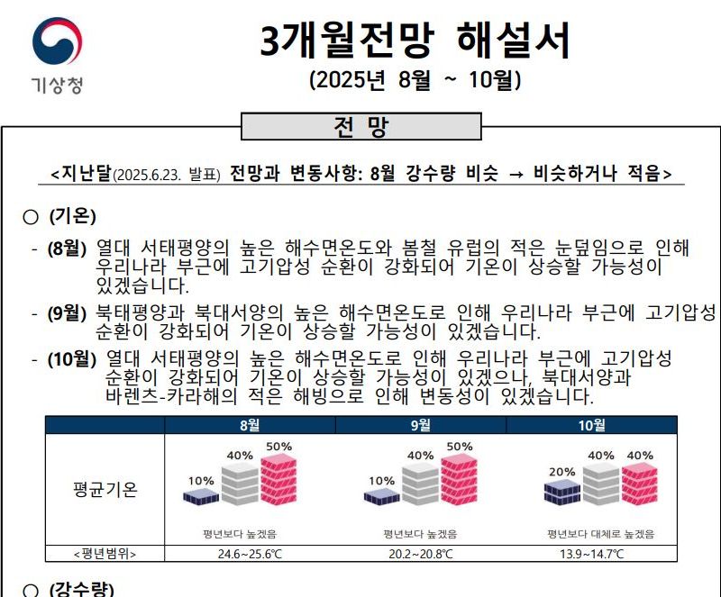 3개월전망 해설서: 8월, 9월은 기온이 평년보다 높고, 10월은 평년보다 대체로 높을 것으로 전망.