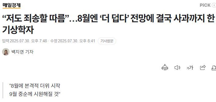 “8월에 본격적 더위 시작 9월 중순께 시원해질 것” - 매일경제 2025.7.30.