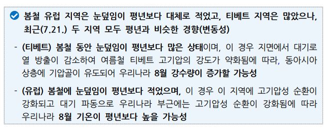 ㅡ 봄철에 유럽지역 눈덮임이 평년보다 적고, 서태평양 수온이 (평년보다) 높아, 대륙과 해양 양쪽에서 고기압성 순환 강화, 덥고 건조한 기류와 덥고 다습한 기류가 모두 유입. 평년보다 더울 것.