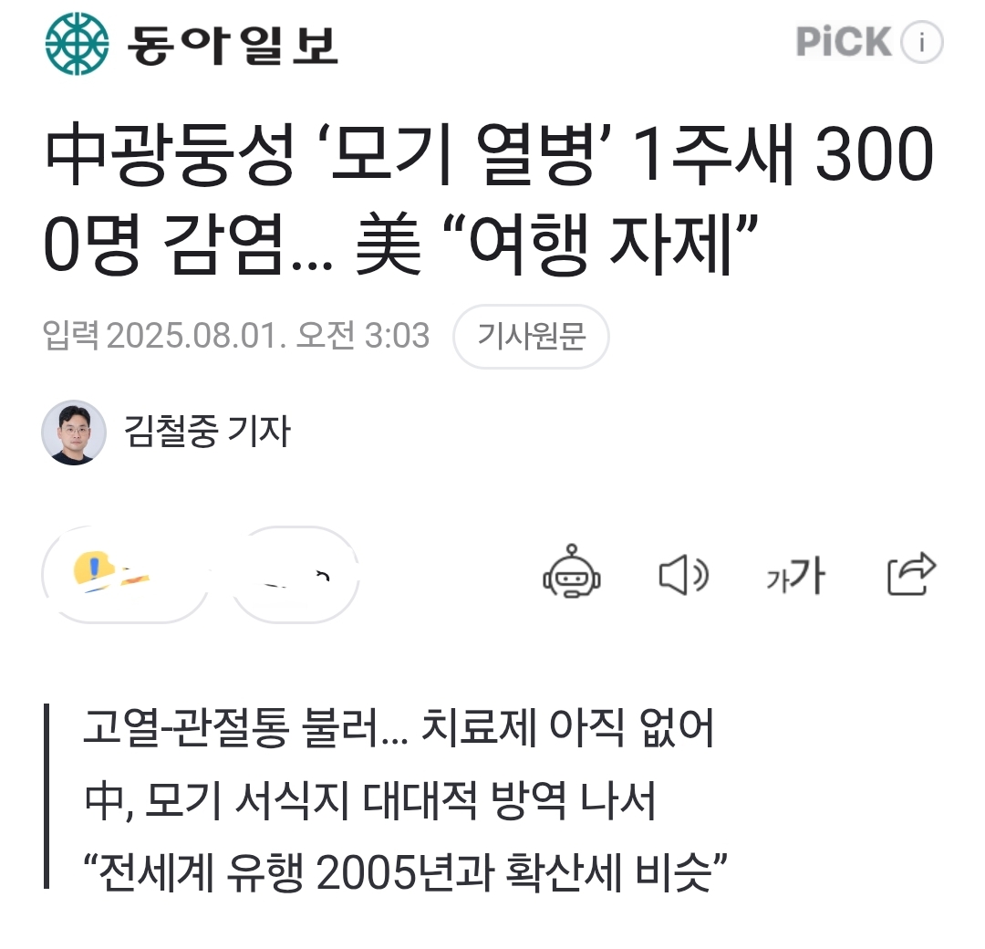 중국 남부 유행은 주춤, 하지만 대만에서도 환자 발생 2025.8.8.