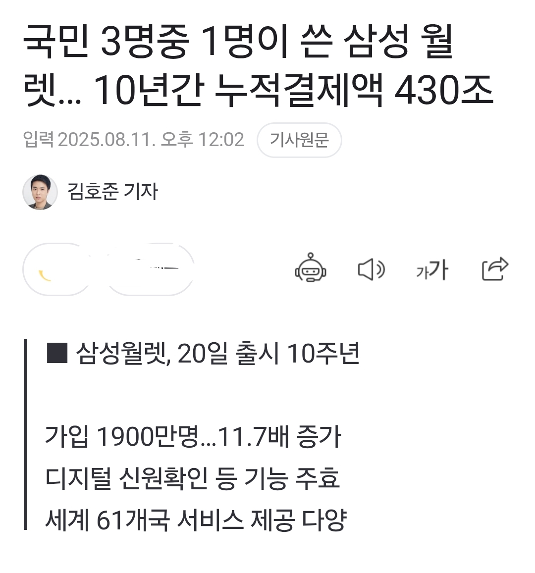 국민 3명중 1명이 쓴 삼성 월렛… 10년간 누적결제액 430조