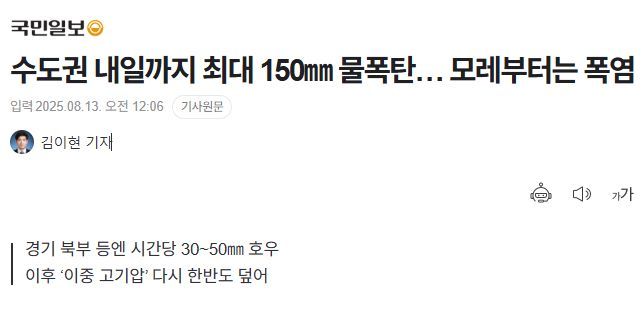 수도권 내일까지 최대 150㎜ 물폭탄… 모레부터는 폭염