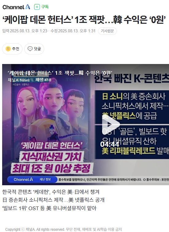 ‘케이팝 데몬 헌터스’ 1조 잭팟…韓 수익은 ‘0원’