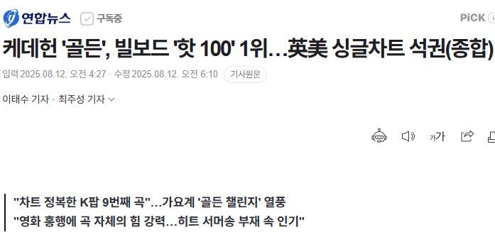 케데헌 '골든', 빌보드 '핫 100' 1위…英美 싱글차트 석권(종합)