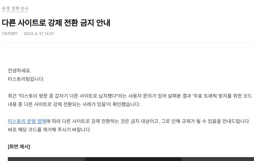 티스토리 블로그의 '다른 사이트로 강제 전환 금지' 공지와 여담 본문