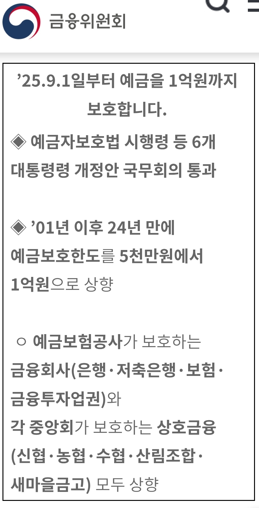 2025.9.1. 부터 예금보호한도 5천만원→1억 (금융위원회) 본문