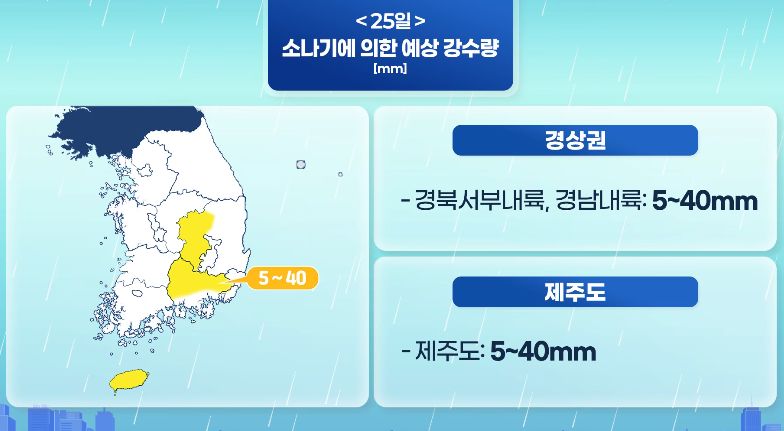 오늘 동쪽 중심 소나기, 내일과 모레 전국 대부분 비. (기상청 예보 25년 8월 24일 05시 기준)
