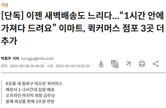 최악의 소비침체와 온라인 커머스의 득세로 침체 일로를 걸어왔던 오프라인 유통사들이 퀵커머스의 편리성을 앞세워 재도약을 꿈꾸고 있다. 이마트와 홈플러스 등 종합 마트는 물론 올리브영·다이소까지 퀵커머스 강화에 팔을 걷어 붙였다. 이로 인해 국내에서 퀵커머스를 통해 물건을 파는 규모가 올해 5조원대로 확대될 전망이다. - 매일경제