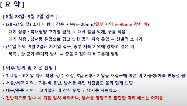 주말까지 중부 소나기. 다음주 초 비 내려도 더위 지속. 동해안 강수는 적다 (2025년 8월 28일 기상청 예보브리핑)