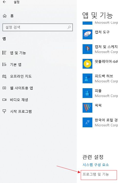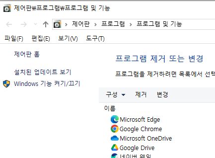 거기서 하단의 "프로그램 및 기능"을 눌러 나오는