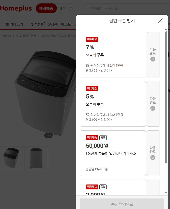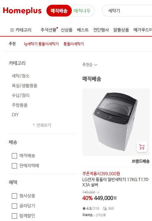 일반세탁기도 당일배송 또는 원하는 시간에 매장에서 직접 매직픽업! 다양한 할인혜택이 가득한 홈플러스만의 신선한 장보기.