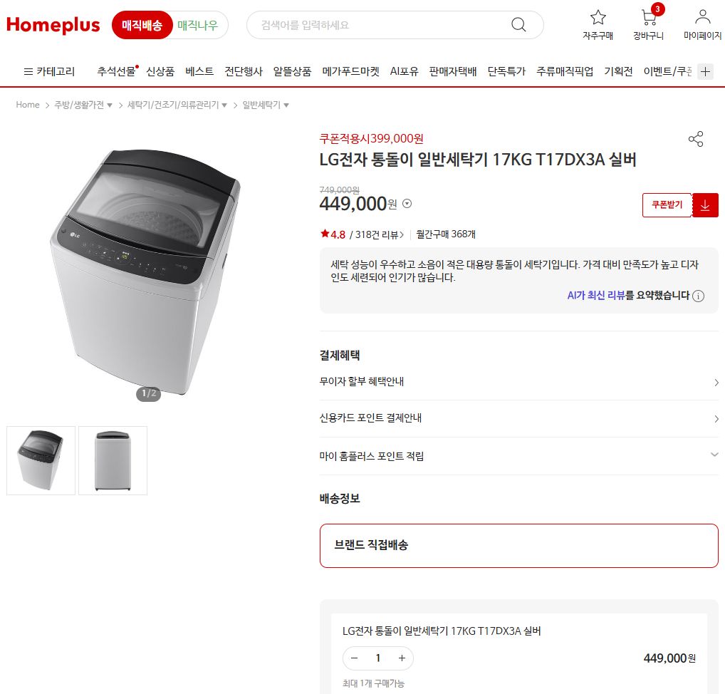 홈플러스) LG전자 통돌이 일반세탁기(인버터DD모터) 17KG T17DX3A 실버 (~38.9만원) 본문