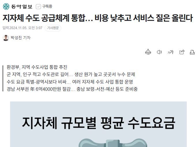 지자체 수도 공급체계 통합… 비용 낮추고 서비스 질은 올린다 - 동아일보 2024.11.05.
