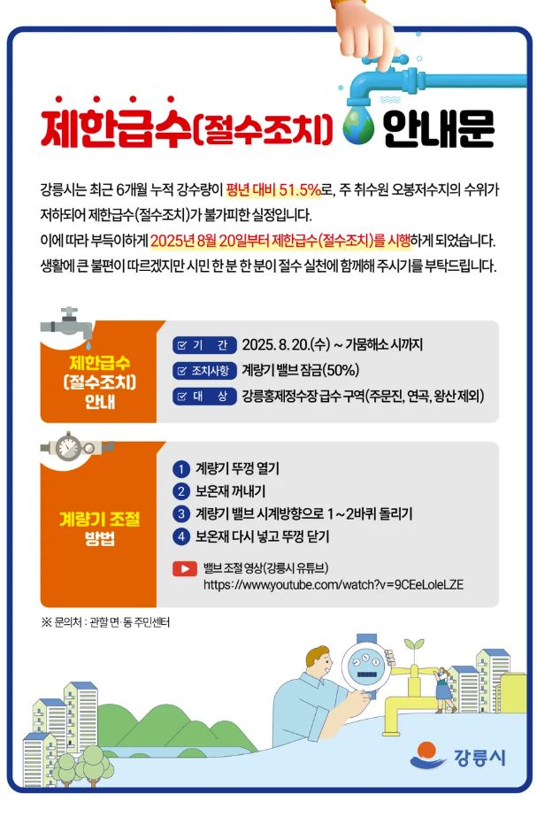 극심한 가뭄과 폭염으로 초유의 물 부족 사태를 겪고 있는 강릉시가 지난 14일부터 주문진·연곡·사천 일부지역을 제외한 시 전지역(홍제정수장 급수구역)에 대해 ‘제